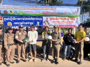 สภ.ท่าตูม มอบหมวกกันน็อคและแผ่นพับให้ความรู้การขับขี่อย่างปลอดภัยฯ ให้ประชาชนที่สัญจรไปมา